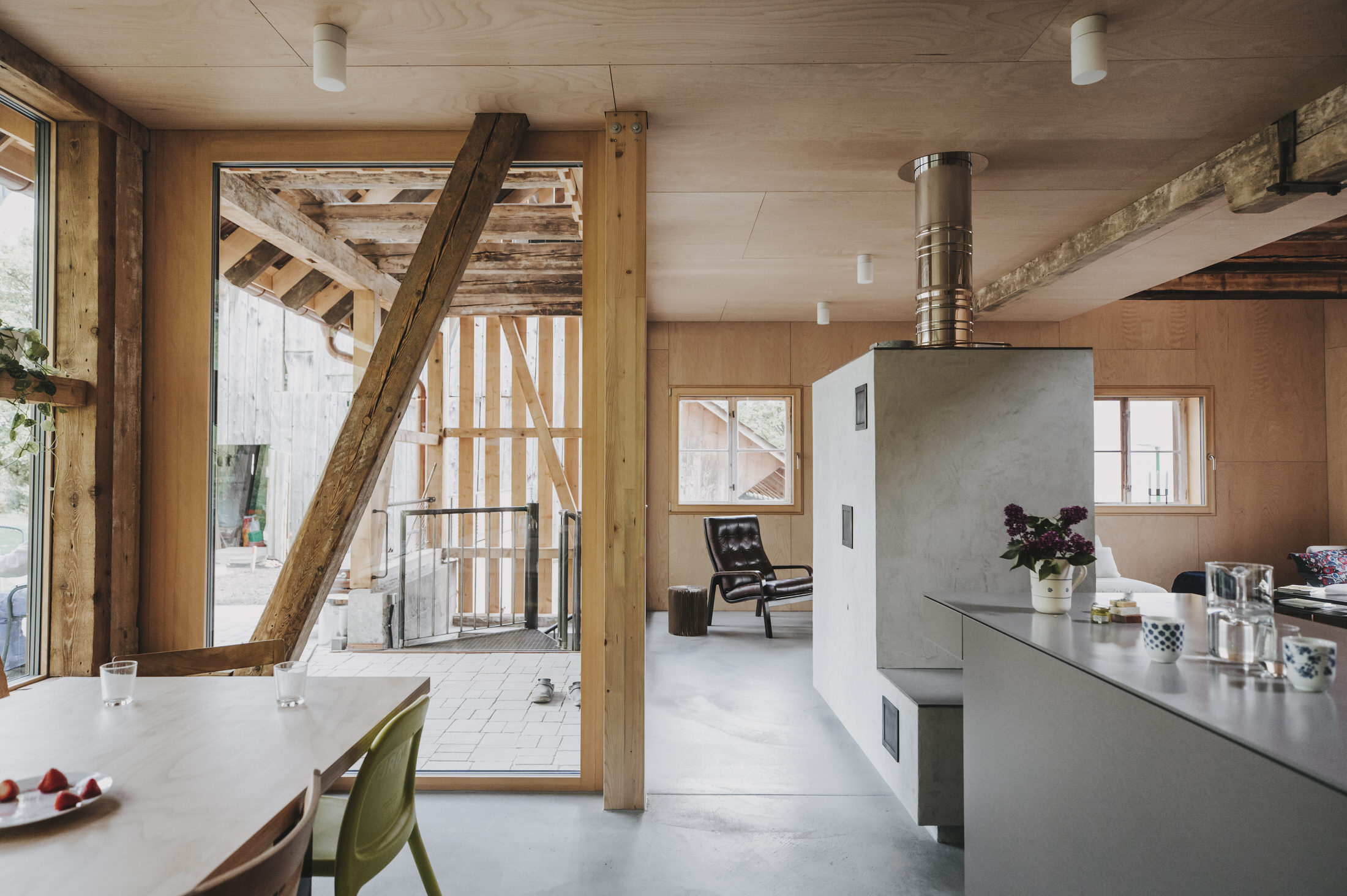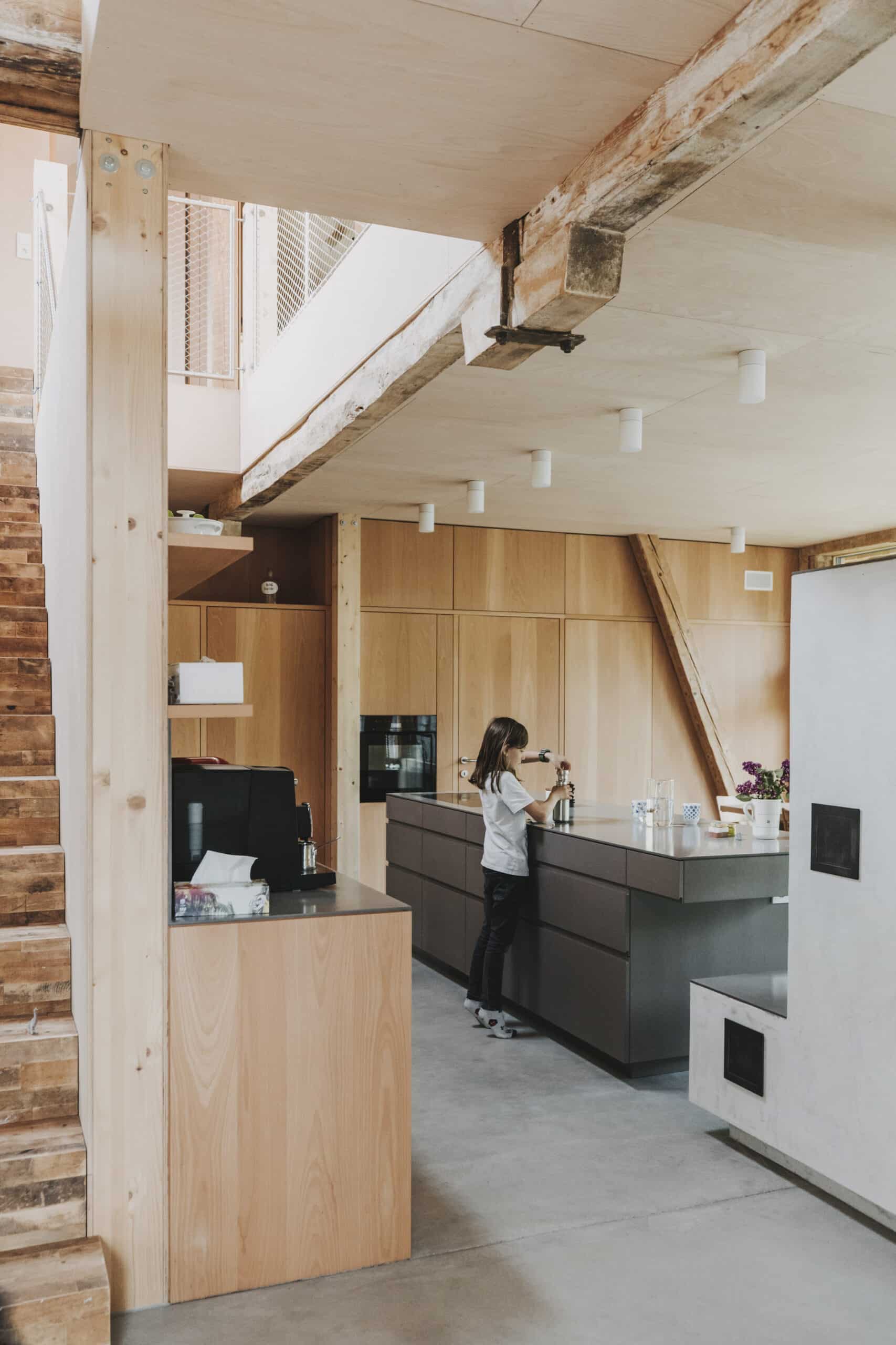 The former workshop space has been transformed into an open-plan living, cooking, and dining area. This space opens upward into the roof volume, revealing the original wooden structure, which now lends character to the interior. The bedrooms and family bathroom are located beneath the roof. Carefully placed skylights create additional headroom and bring generous natural light into the space. The open void above the living area also allows light to enter from above, enhancing the bright and spacious atmosphere.