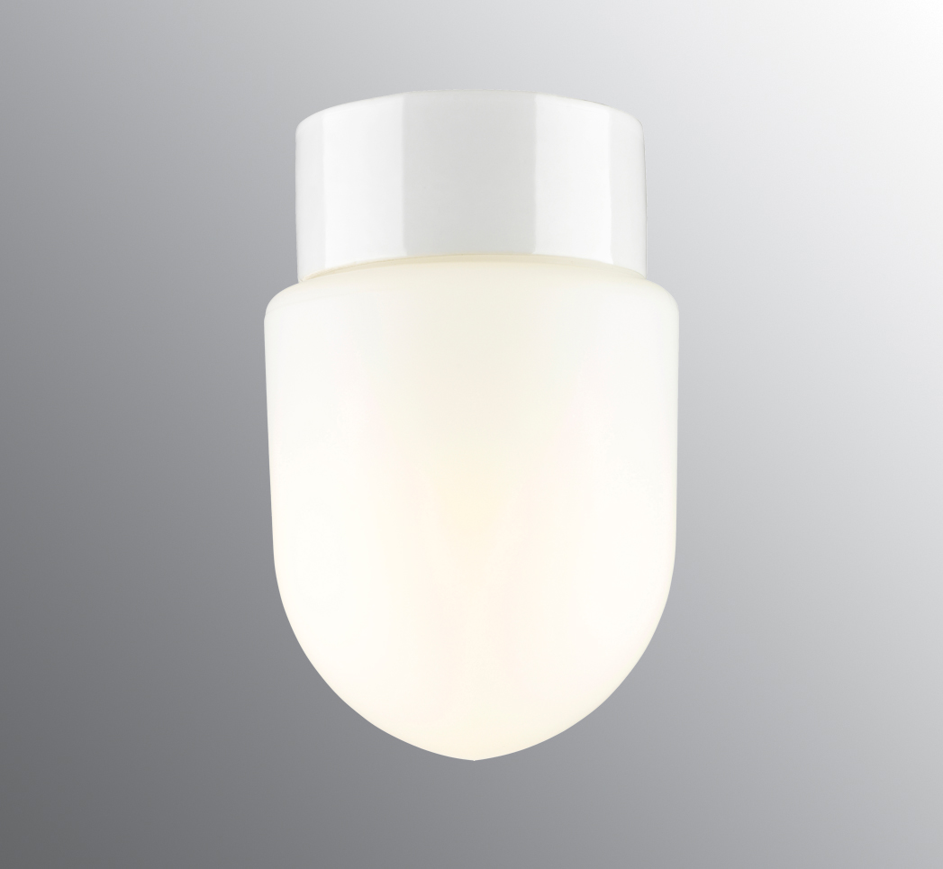 A sauna light fitting from the Contrast series with a ceramic socket and matt opal shade. Available with a straight base for installation in the ceiling or on the wall.