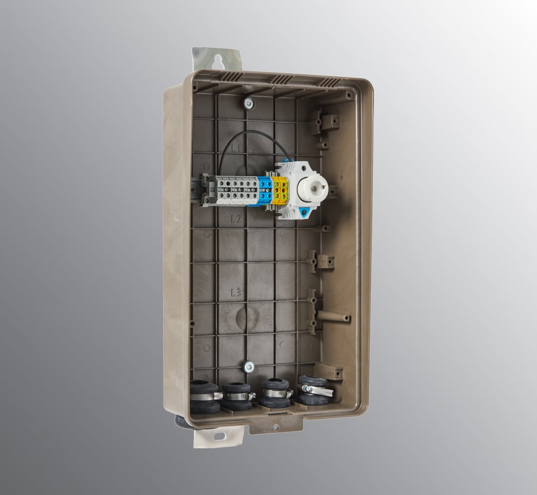 Fördelningsskåp för jämn fördelning av belastningen på matande (TN-C) 3-faskabel till gatubelysning. Inkommande och utgående femledar 3-faskabel ansluts på DIN monterade dubbelplintar, 0,5 mm2 -16 mm2, Cu- alt. Al-kabel (Al-kabel: etsande fett måste användas). Belysningsarmaturen ansluts via avsäkrad 6A utgång på säkringssockel och vald fas L1, L2 eller L3 för jämt belastning, jord och nolla ansluts på DIN monterade plintar. Skåpet levereras med fästkonsol i aluminium och fästskruvar för stolpmontage. Skåpet är utrustat med EBR-lås. Kabelgenomföringar i skåpets botten, 3 st för kabel med diameter 15–31 mm (max 50 mm2) och 1 st för kabel med diameter 15–37 mm (max 95 mm2).